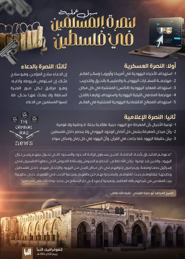 - Присоединяться к ИГ, чтоб воевать со всеми кто занимается охраной интересов Израиля в странах Ближнего Востока, а так же с самими иудеями внутри Палестины и за ее пределами (цитируется покойный пресс-секретарь Абу Хамза аль-Курейши).